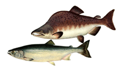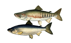 Форель (Лосось стальноголовый) - довольно крупная (до 115 см) рыба с металлически-синей спиной и серебристыми боками. Выше боковой линии имеются темные пятна; у самцов во время нереста на боках тела красная полоса. Стальноголовый лосось два года нагуливается в водах Тихого океана и входит в реки от Калифорнии до Аляски на 3-5-м году жизни. Нерест в конце зимы или весной. Молодь скатывается в море на 1-2-м году жизни и может предпринимать значительные по протяженности морские путешествия, во время которых питается ракообразными, мелкой рыбой и кальмарами. Стальноголовый лосось образует и жилые формы, аналогичные озерным и ручьевым форелям. Они очень разнообразны и неоднократно описывались как самостоятельные виды. За яркую и пеструю окраску жилые формы называют радужными форелями (rainbow trout). Одна из этих форм, ранее описанная под названием радужной форели (Salmo irideus), стала объектом прудового рыбоводства и широко разводится во многих странах. Любопытна история акклиматизации радужной форели в Южной Америке. На границе Перу и Боливии на высоте 3812 м над уровнем океана расположено огромное (222 км в длину, 113 км в ширину) озеро Титикака. В нем практически нет промысловых рыб, поэтому в 1939 году туда завезли несколько видов жилых лососевых. Все они достигли неслыханных ранее размеров, радужная форель опередила всех (122 см длиной и 22,7 кг весом). В настоящее время многие исследователи считают камчатскую семгу и стальноголового лосося одним видом, а микижу - камчатским аналогом радужной форели.